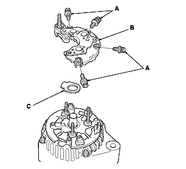 4. Remove the three flange nuts (A) and the screw (B) from the alternator, then remove the terminal plate (C).