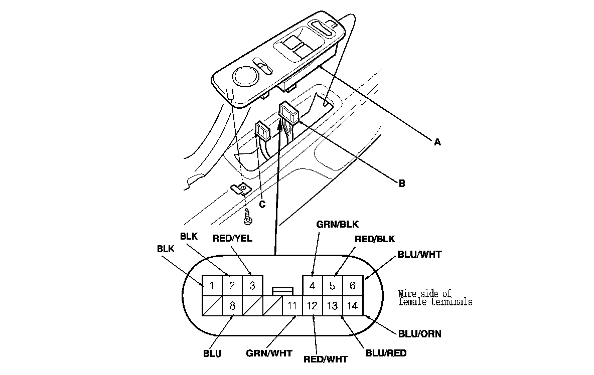3. Disconnect the 14P connector (B) and the 10P connector (C) from the power window master switch.