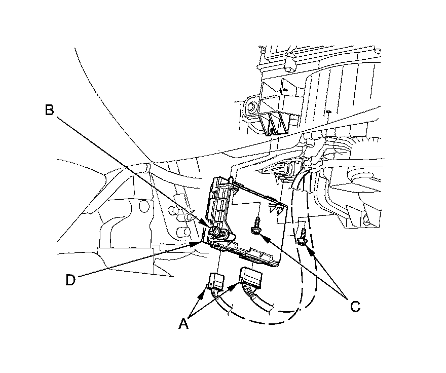 2. Disconnect the connectors (A). Loosen the bolt (B) and remove the bolts (C) from the climate control unit (D).