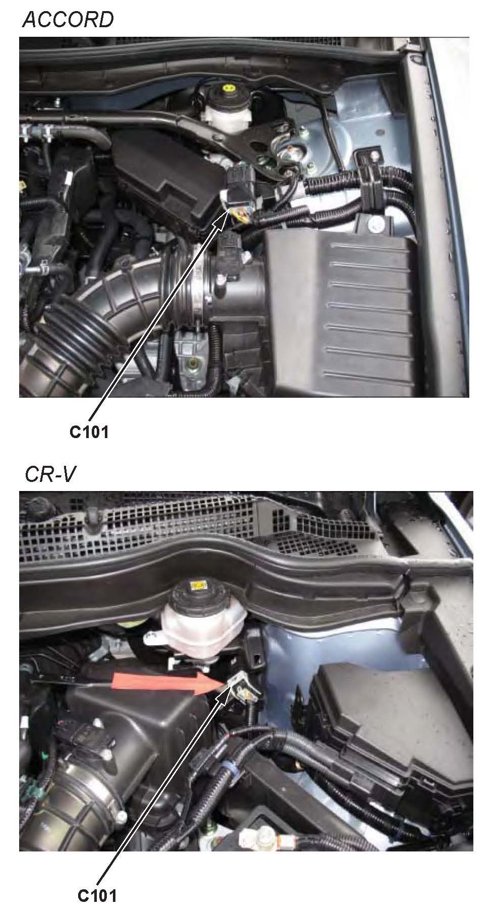 ^ For a complete list of the wire terminals and circuits in the C101 junction connector, refer to Connector Terminal View 264 in the 2010 Accord ETM, or Connector Terminal View 279 in the 2010 CR-V ETM.