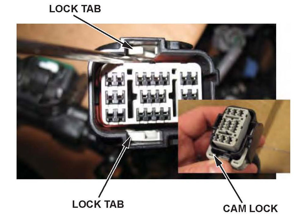 6. With the engine harness connector disconnected from the junction connector, press the two spring-loaded lock tabs on the engine harness connector cam lock, and close the cam lock.