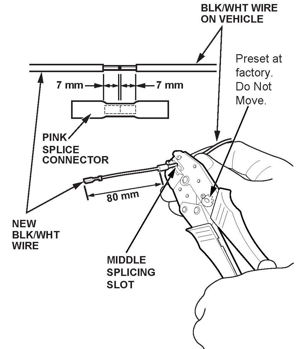 11. Insert the stripped end of the BLK/WHT wire from the kit and the BLK/WHT wire on the vehicle into each side of the pink splice connector from the kit. Then crimp the splice connector using the middle splicing slot on the wire crimper (T/N 07NGZ-001010A) from Terminal Pin Kit C. Slightly pull on both sides of the wire to make sure it's secured in the splice connector.