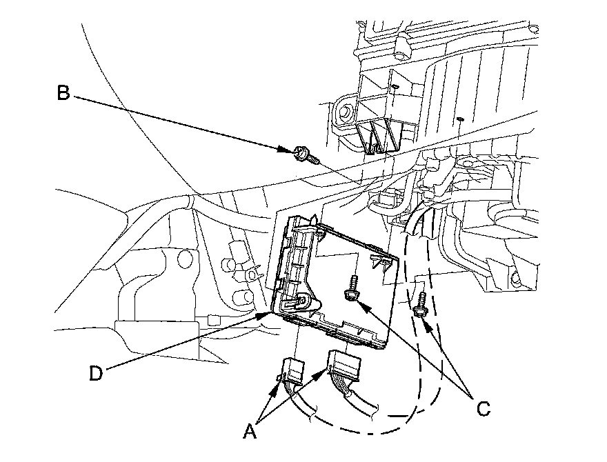 2. Disconnect the connectors (A). Loosen the bolt (B) and remove the bolts (C) from the climate control unit (D).