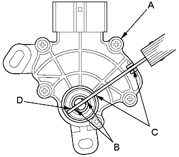 6. Set a new transmission range switch (A) to the N position. Align the cutouts (B) on the rotary-frame with the neutral positioning cutouts (C) on the transmission range switch, then put a 2.0 mm (0.08 in) feeler gauge blade (D) in the cutouts to hold the transmission range switch in the N position.