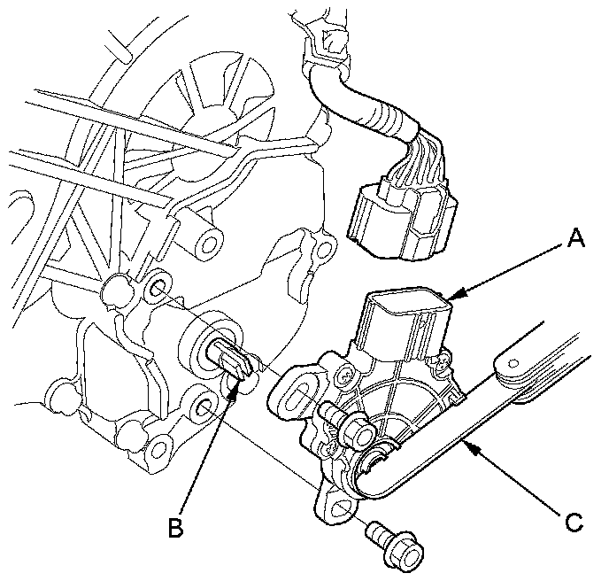 7. Install the transmission range switch (A) gently on the selector control shaft (B) while holding it in the N position with the 2.0 mm (0.08 in) feeler gauge blade (C).