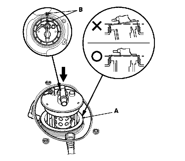 1. Temporarily attach a new base gasket (A) to the fuel tank unit (B), then insert the fuel tank unit partially into the fuel tank.