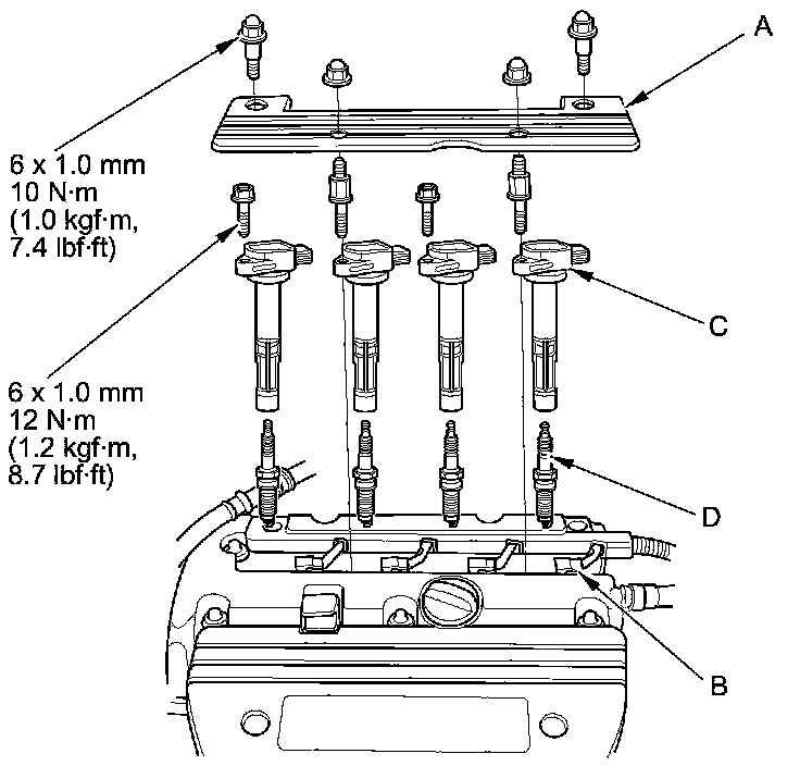 2. Disconnect the ignition coil connectors (B), then remove the ignition coils (C).