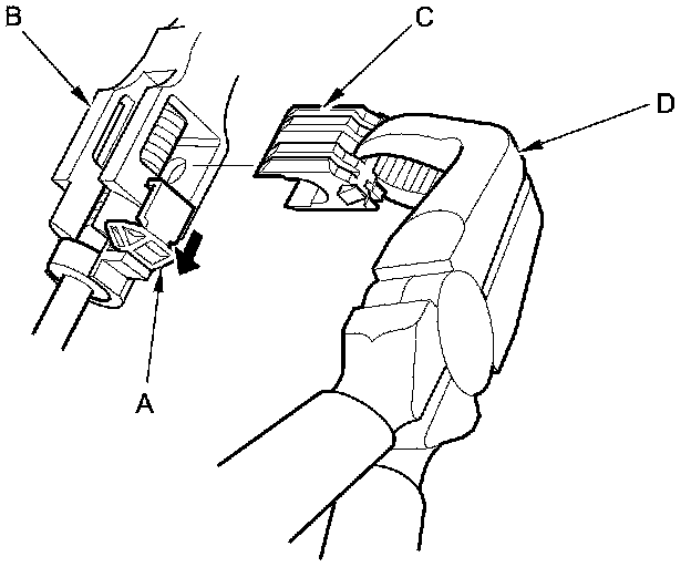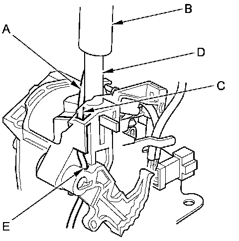 19. Remove the terminal (C) from the connector by pushing the lock tab (D) up in the connector using a thin blade screwdriver (E). Remove all four terminals.