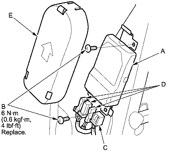 1. Place the ODS unit (A) on the seat-back frame. Tighten the two screws (B), and connect the ODS unit 18P connector (C) and the OPDS sensor connectors (D) to the ODS unit. Reinstall the cover (E).