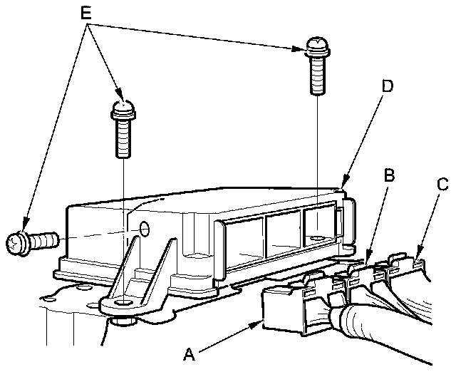5. Pull down the carpet, then remove the TORX bolts (E) using a TORX T30 bit. Pull out the SRS unit.