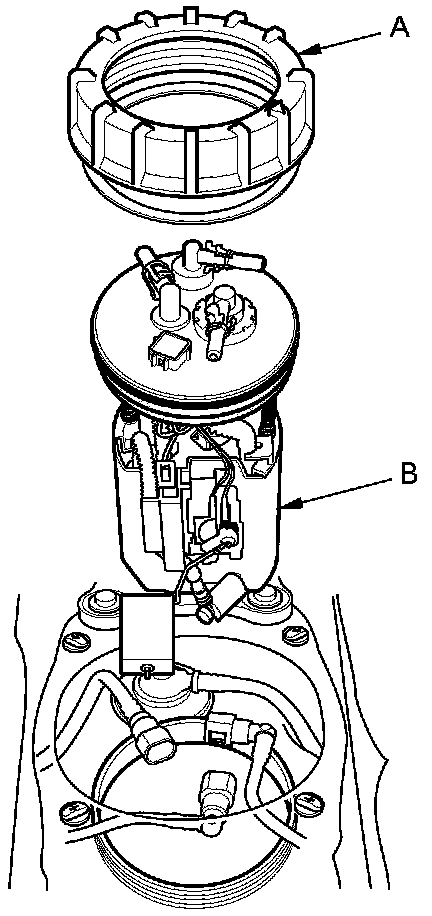 8. Remove the locknut (A) and the fuel tank unit (B).