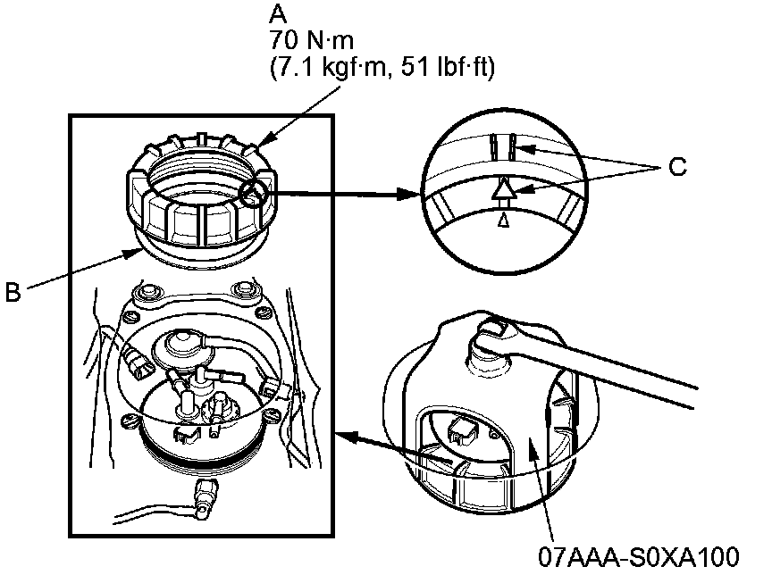 - Before tightening, align the marks (C) on the fuel tank and the locknut.