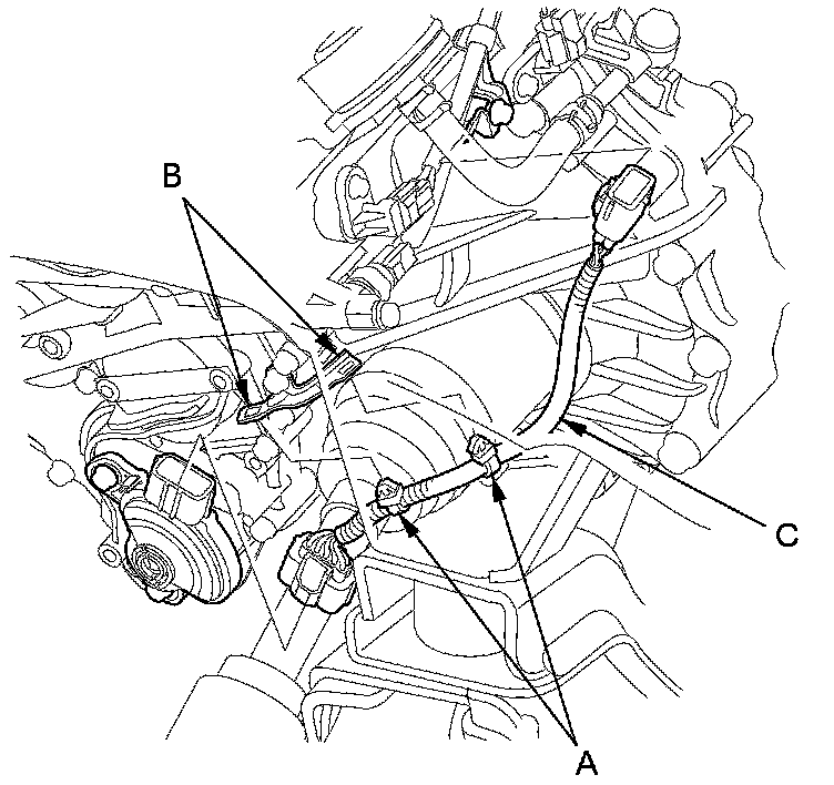 9. If the transmission range switch continuity check is OK, replace the faulty transmission range switch harness; remove the harness clamps (A) from the clamp bracket (B), remove the transmission range switch harness (C).