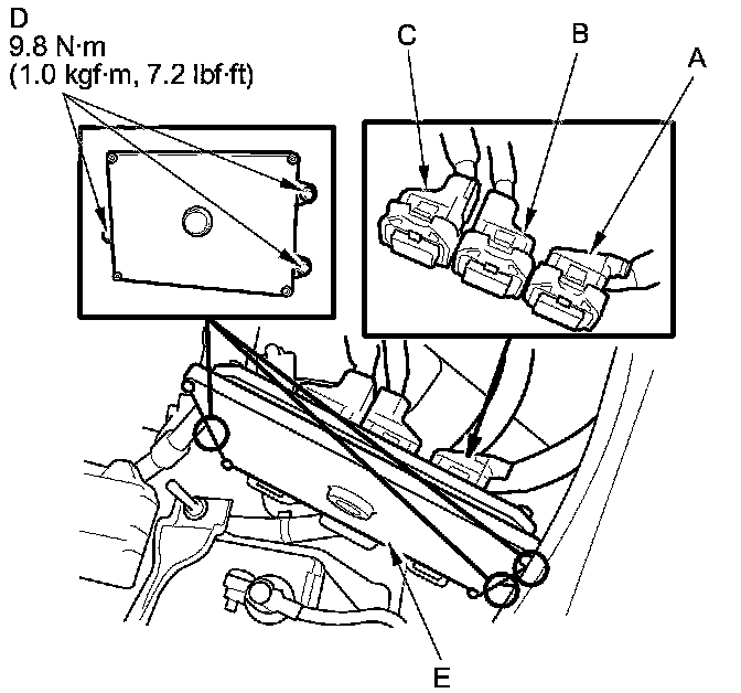 13. Disconnect PCM connectors A, B, and C, then remove the PCM (E).