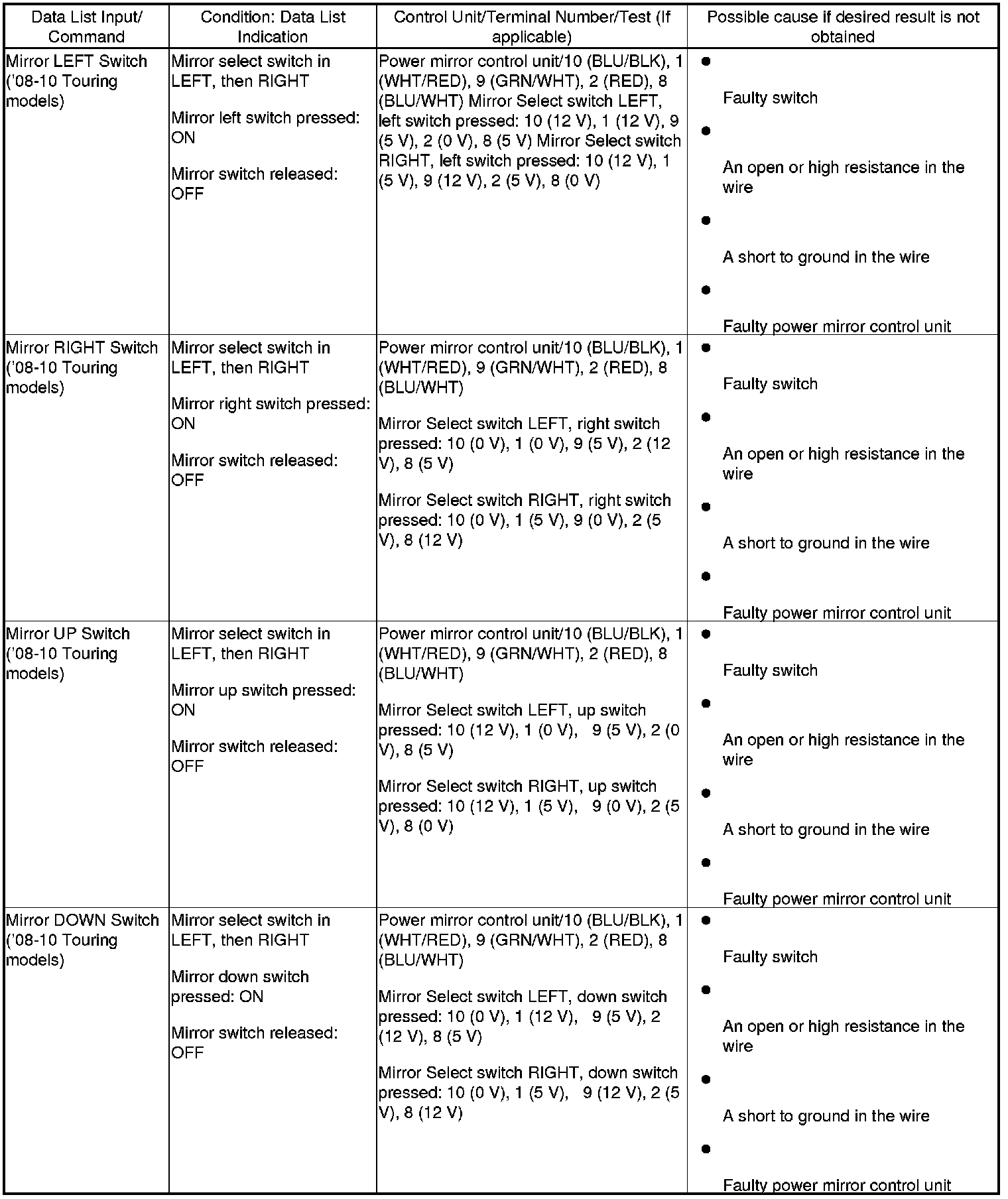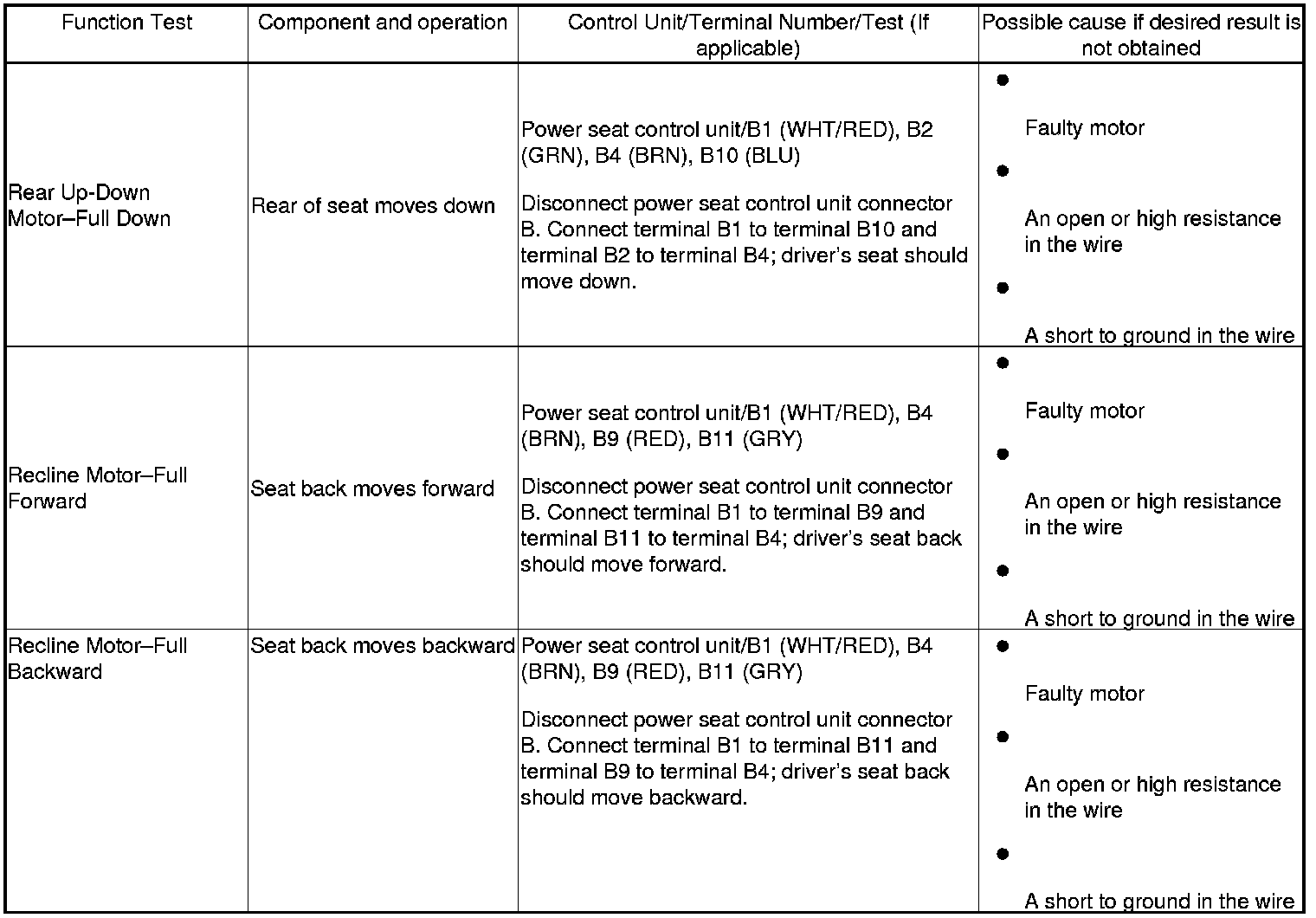 - If the function does not operate normally, perform the appropriate test at the control unit and terminal indicated in the table.