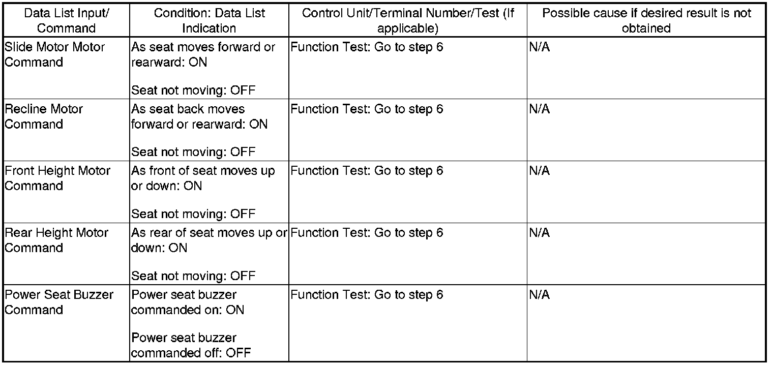 4. Exit the DTC mode and select DATA LIST from the POWER SEAT/POWER MIRROR TEST MODE menu.