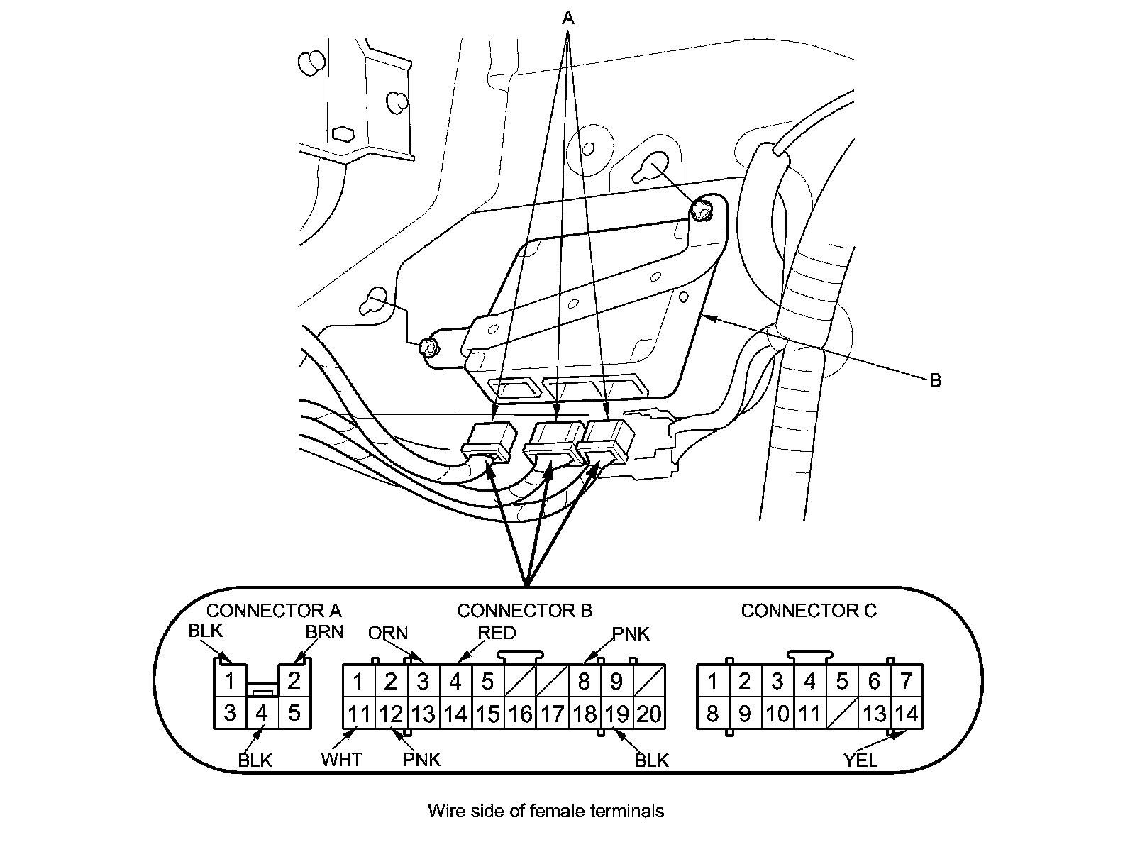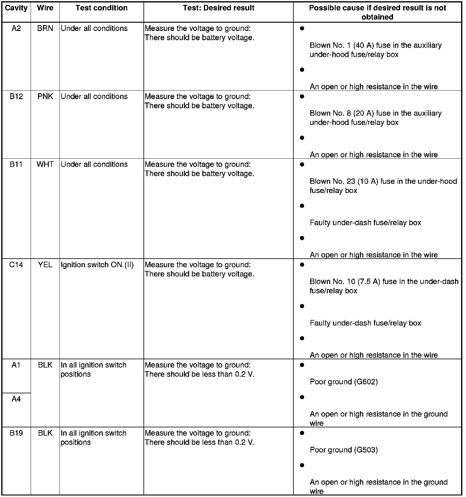 NOTE: Before testing, troubleshoot the multiplex integrated control unit first, using B-CAN System Diagnosis Test Mode A Troubleshooting - B-CAN System Diagnosis Test Mode A.