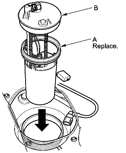1. Temporarily attach a new base gasket (A) to the fuel tank unit (B), then insert the fuel tank unit partially into the fuel tank.