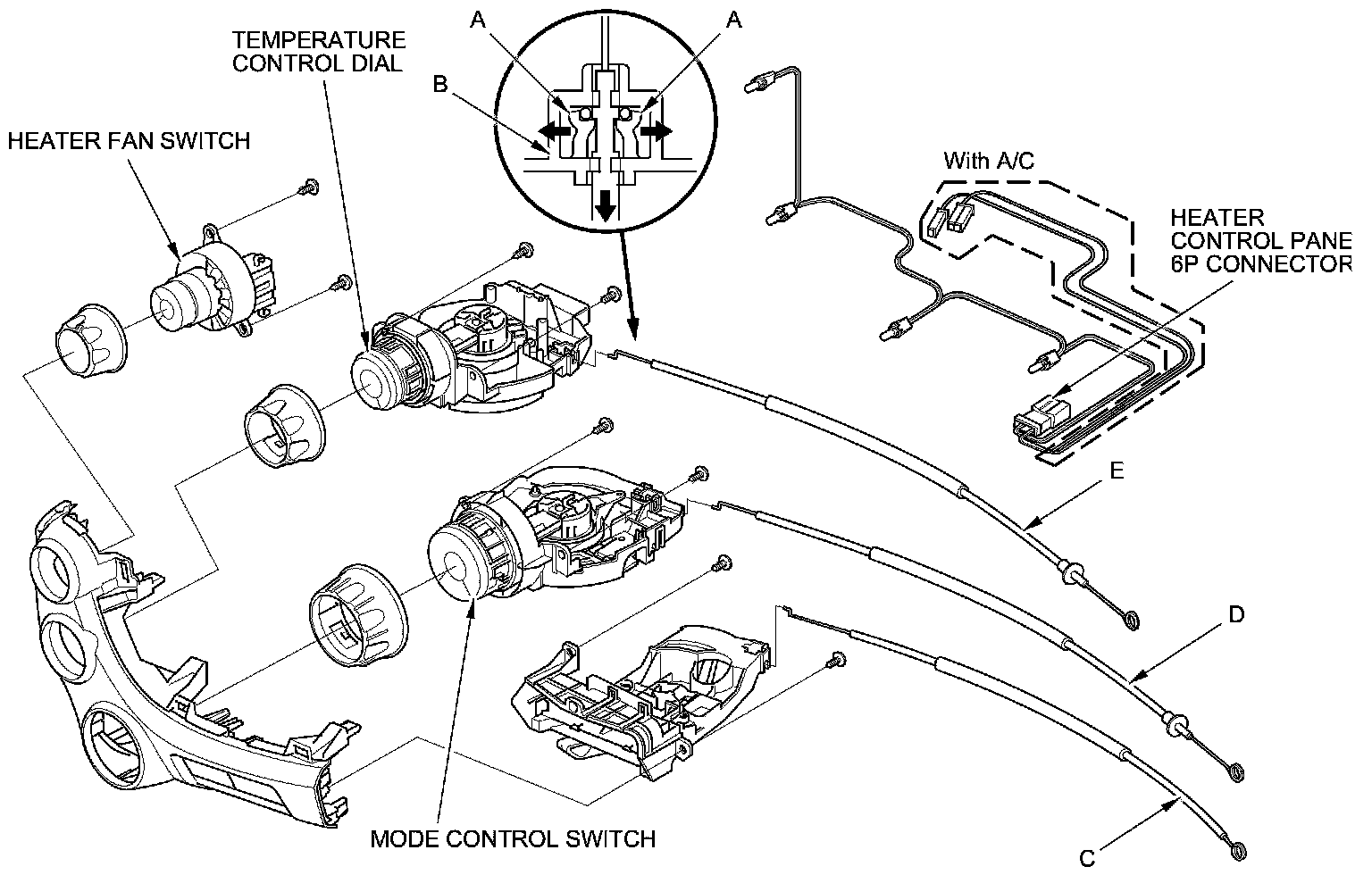 2. Spread the cable stops (A) in the cable holders (B) with snap ring pliers, then pull out the recirculation control cable (C), the mode control cable (D), and the air mix control cable (E).