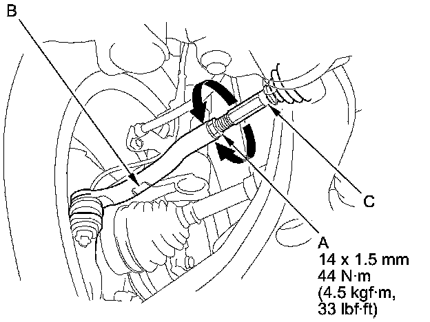 3. Loosen the tie-rod locknuts (A) while holding the flat surface sections (B) of the tie-rod end with a wrench, and turn both tie-rods (C) until the front toe is within specifications.