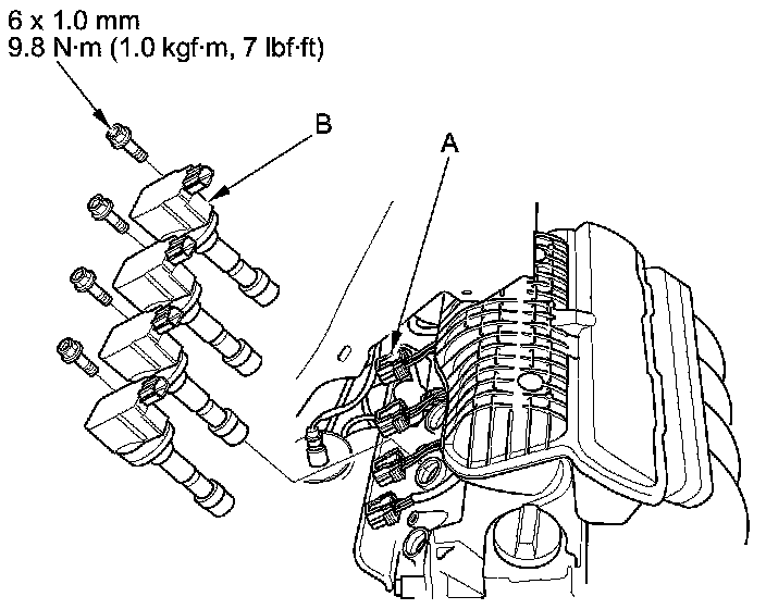 2. Disconnect the ignition coil connectors (A), then remove the ignition coils (B).