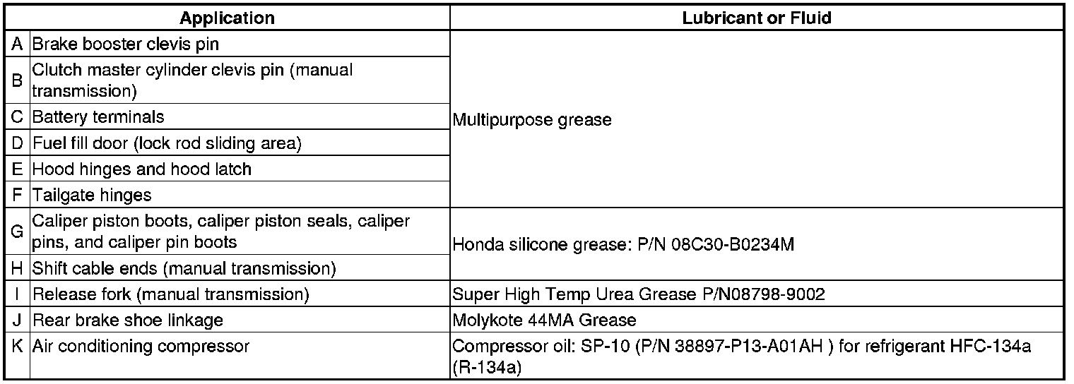 - Lubricate the following areas using the recommended lubricants and fluids.