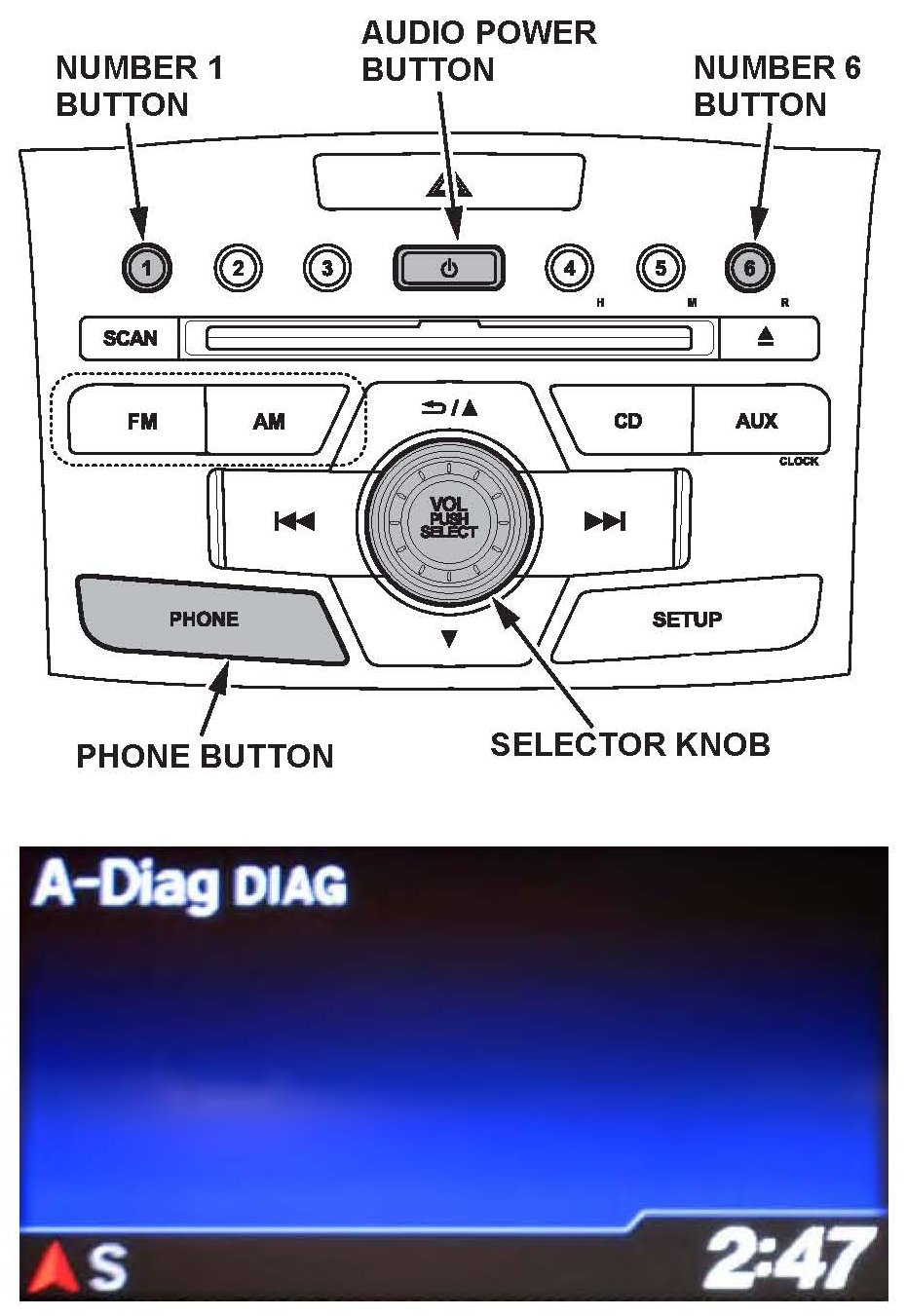 9. Press and hold the audio preset No. 1 button, then press and hold the audio preset No. 6 button. Finally, press and hold the audio power button. Release the buttons once the audio unit enters the self-diagnosis mode and the "A-Diag DIAG" screen appears.