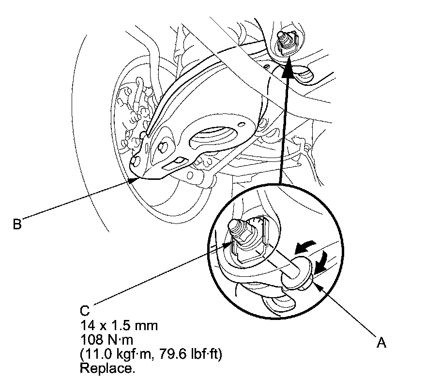 3. Hold the adjusting bolt (A) on the lower arm B, and loosen the self-locking nut (C).
