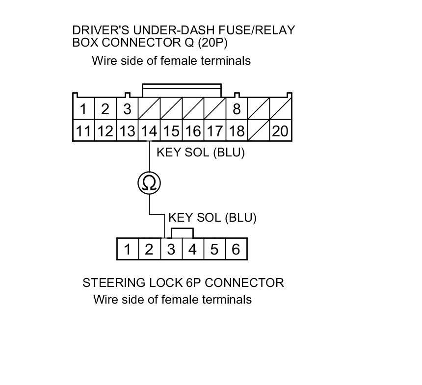 12. Check for continuity between driver's under-dash fuse/relay box connector Q (20P) terminal No. 14 and steering lock 6P connector terminal No. 3.