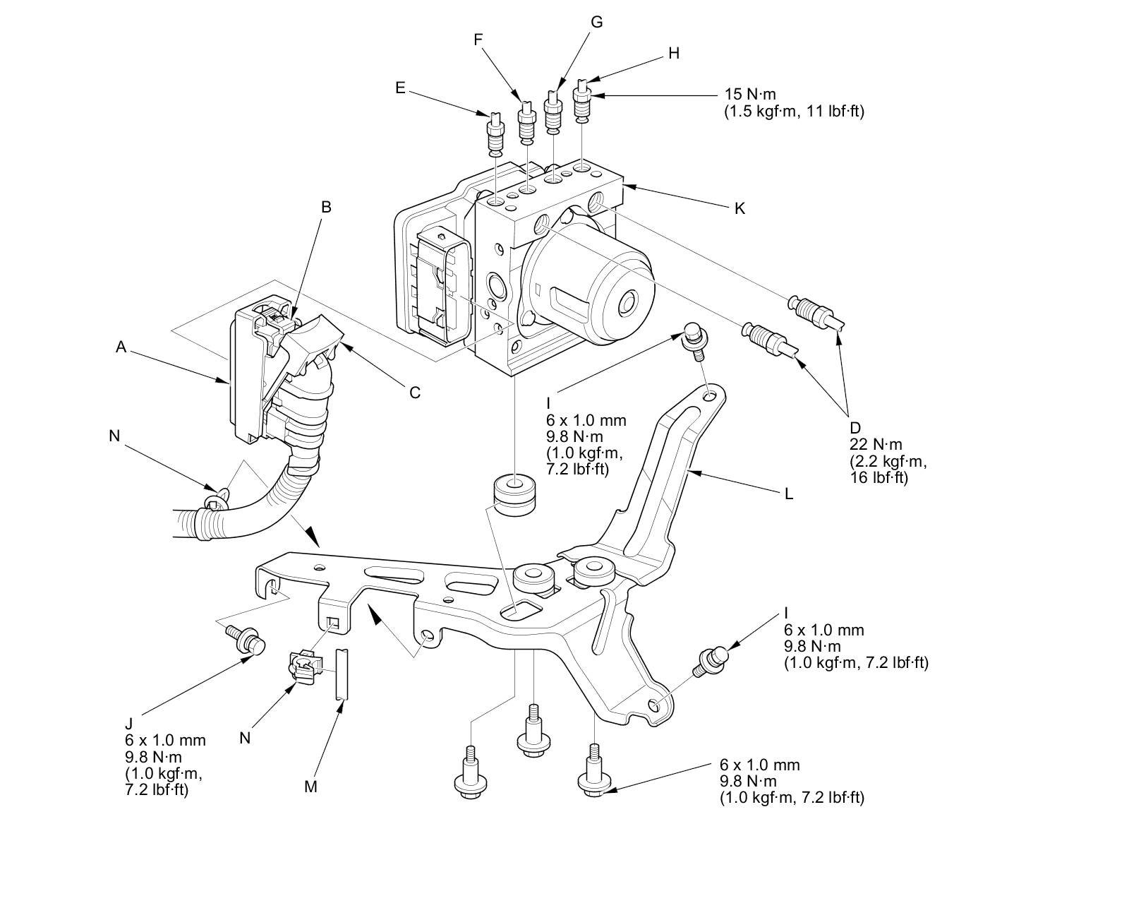 5. Remove the 6 x 12 mm flange bolts (I) and 6 x 16 mm flange bolt (J), then remove the VSA modulator-control unit (K) with the bracket (L) from the body.
