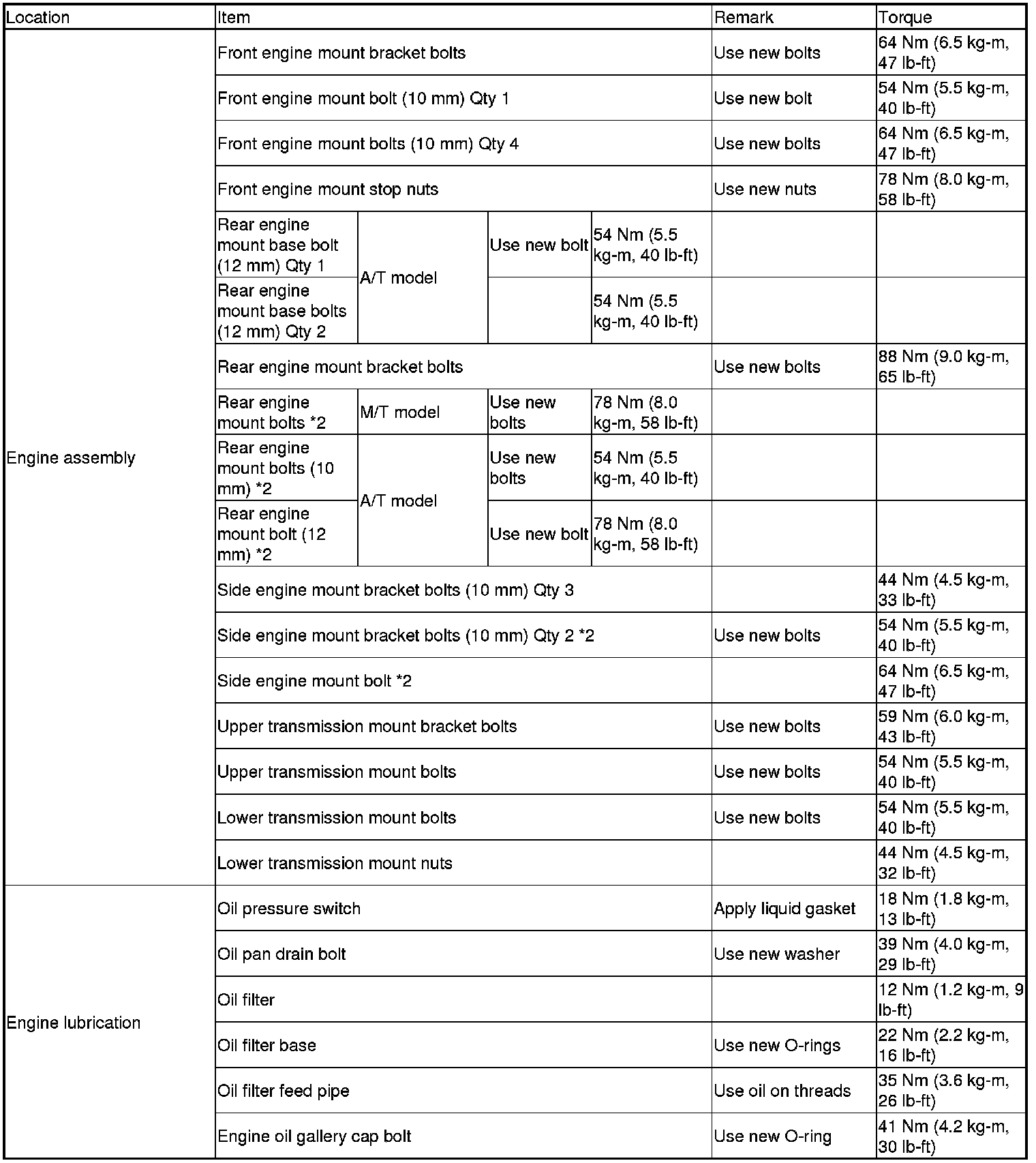 *Refer to each S/M section for the bolts/nuts not indicated here.