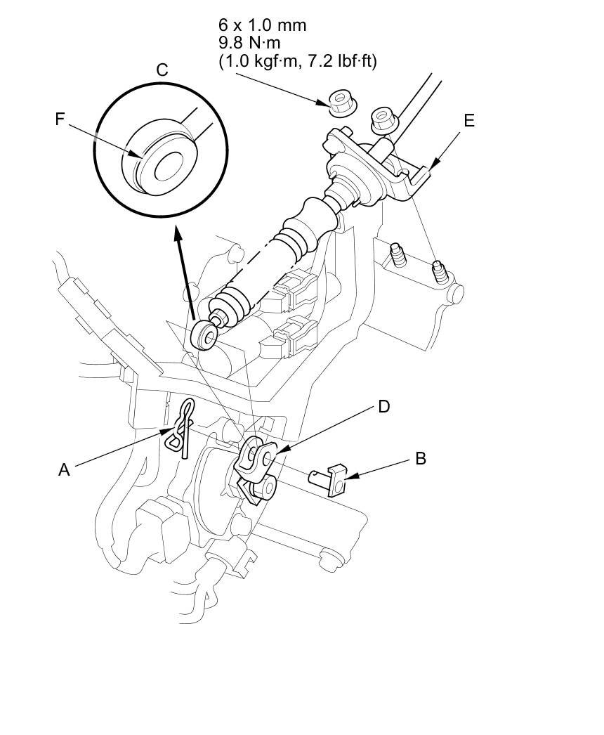 6. Check the bushing (F) in the shift cable end for proper fit and wear. If the bushing is loose or worn, replace the shift cable Service and Repair.