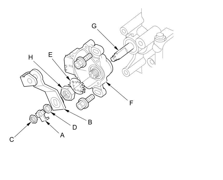 9. Pry the lock tabs of the lock washer (E) on the transmission range switch (F), hold the selector control shaft (G) with a 6.0 mm wrench, and loosen the locknut (H).