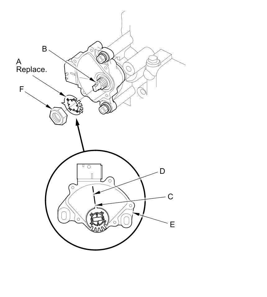 14. Install a new lock washer (A) over the selector control shaft (B) by aligning the indicator tab (C) of the lock washer with the N positioning line (D) on the transmission range switch (E), and install the locknut (F).