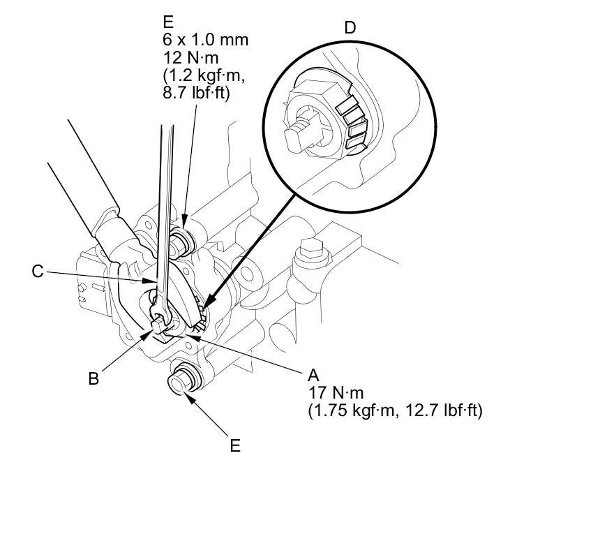 16. Tighten the bolts (E) securing the transmission range switch to 12 Nm (1.2 kg-m, 8.7 lb-ft).