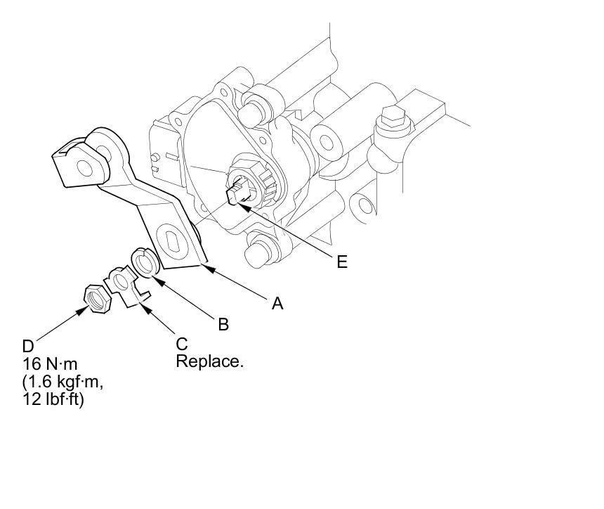 17. Install the selector control lever (A), the spring washer (B), a new lock washer (C), and the locknut (D) on the selector control shaft (E). Bend the lock tab of the lock washer against the locknut.