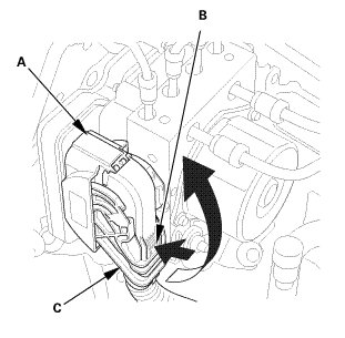 4. Disconnect the connector (A) by pushing the lock (B) and pulling up the lever (C); the connector disconnects itself.