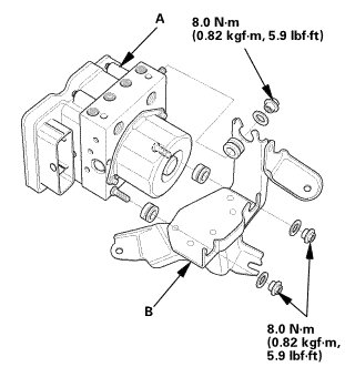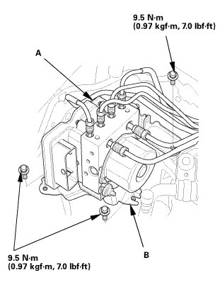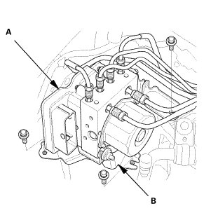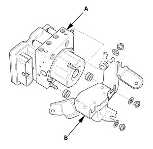 1. Install the VSA modulator-control unit (A) with the bracket (B) to the body.