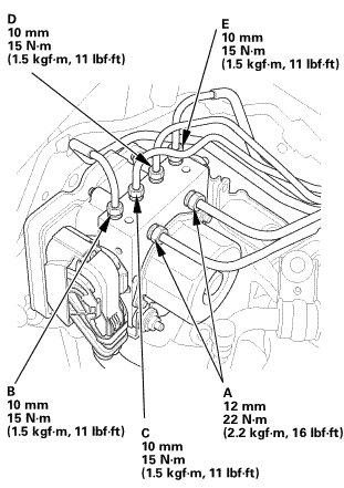 NOTE: Brake lines are connected to the master cylinder (A), the left-rear (B), the right-front (C), the left-front (D), and the right-rear (E) brake systems.
