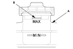 1. Make sure the brake fluid level in the reservoir tank (A) is at the MAX (upper) level line (B).