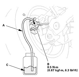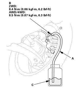 4. Submerge the other end of the drain tube into a clear plastic catch bottle of brake fluid (C).
