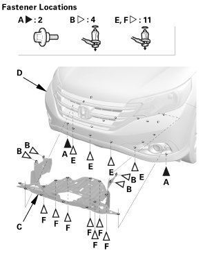 3. From under the body, remove the clips (F), then pull out the front splash shield.