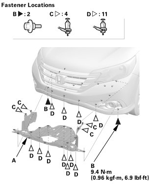 1. Install the front splash shield (A), then install the bolts (B) and the clips (C, D). Make sure the clips snap into place securely.