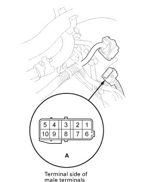 2. Check for continuity between terminals at the transmission range switch subharness 10P connector. There should be continuity between the terminals in the table for each shift lever position.