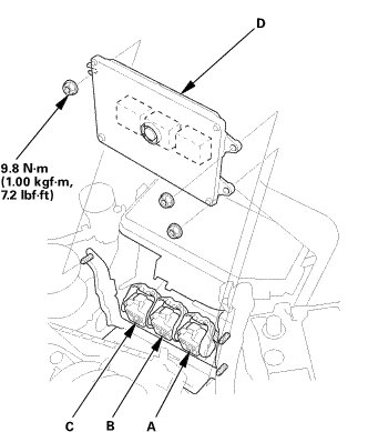 NOTE: ECM connectors A, B, and C have symbols (A=(square), B=(triangle), C=(circle)) embossed on them for identification.