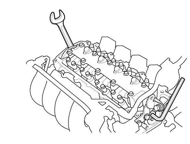 7. Hold the camshaft with an open-end wrench, then loosen the bolt.