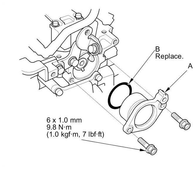 3. Install the camshaft thrust cover (A) with a new O-ring (B).