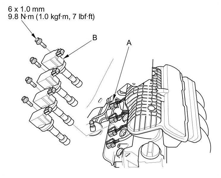 2. Disconnect the ignition coil connectors (A), then remove the ignition coils (B).