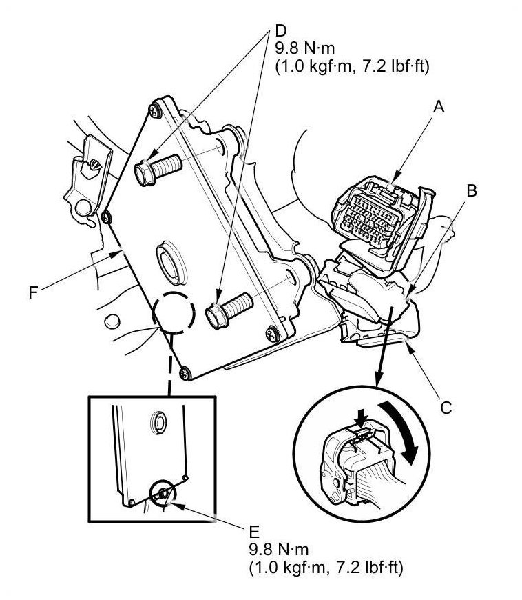 15. Disconnect ECM/PCM connectors A, B, and C, then remove the ECM/PCM (F).
