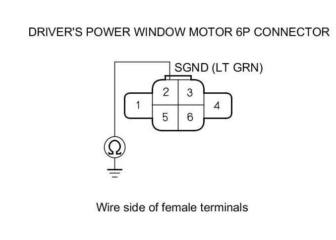 8. Check for continuity between the driver's power window motor 6P connector terminal No. 2 and body ground. There should be continuity.